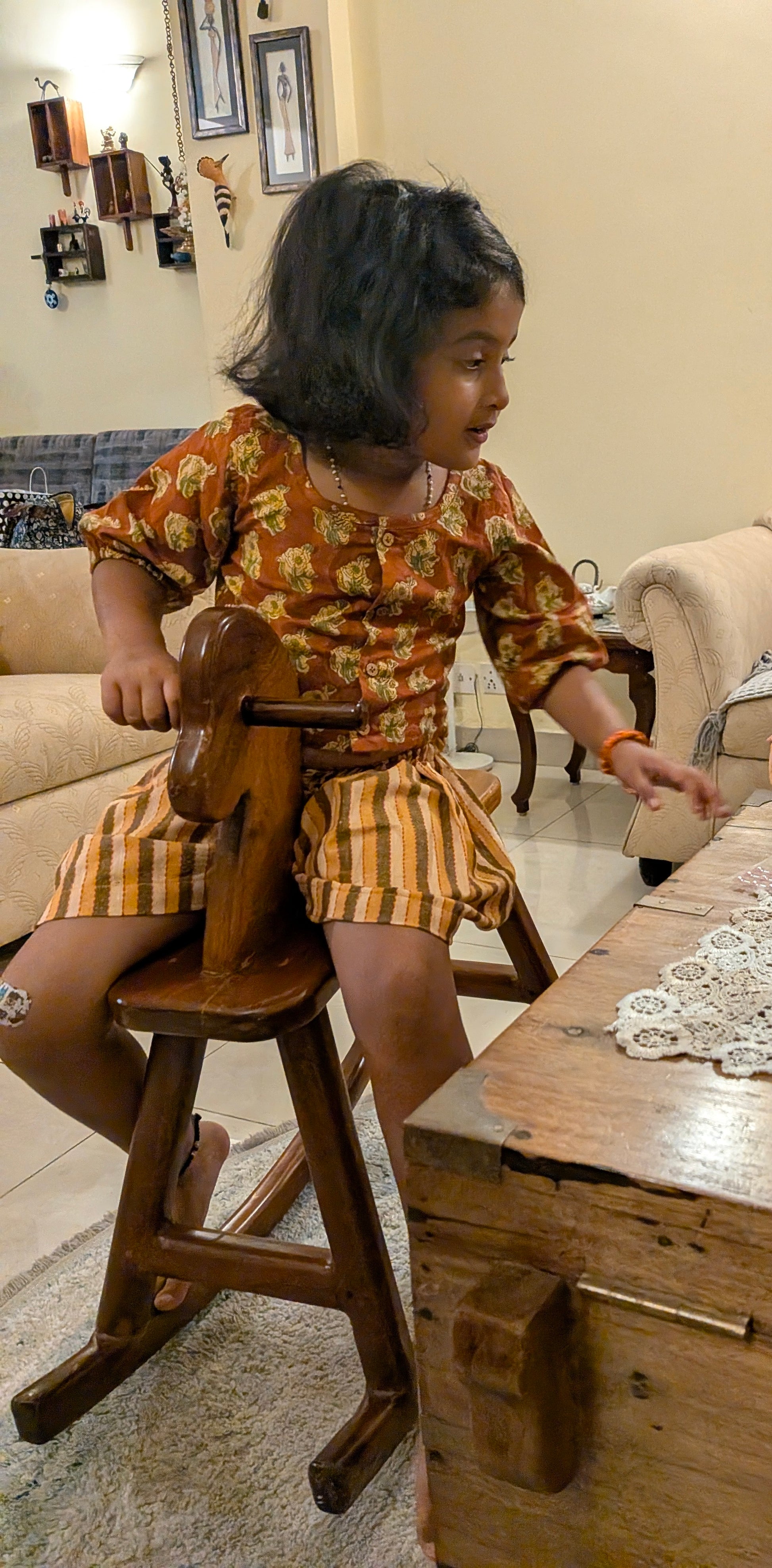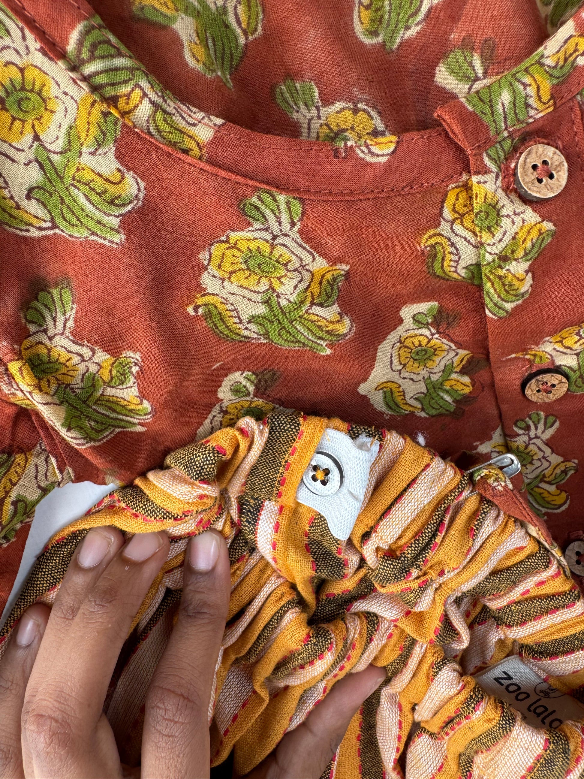This cotton crop top and skirt set combines traditional charm with modern comfort. The crop top, crafted from handloom and soft cotton, features elbow-length sleeves and distinctive coconut buttons for a subtle yet authentic detail. The skirt made of soft cotton offers an adjustable elasticated waistband, ensuring a perfect fit throughout the day. Ideal for all-day wear, this ensemble provides breathable comfort while honoring artisanal craftsmanship.