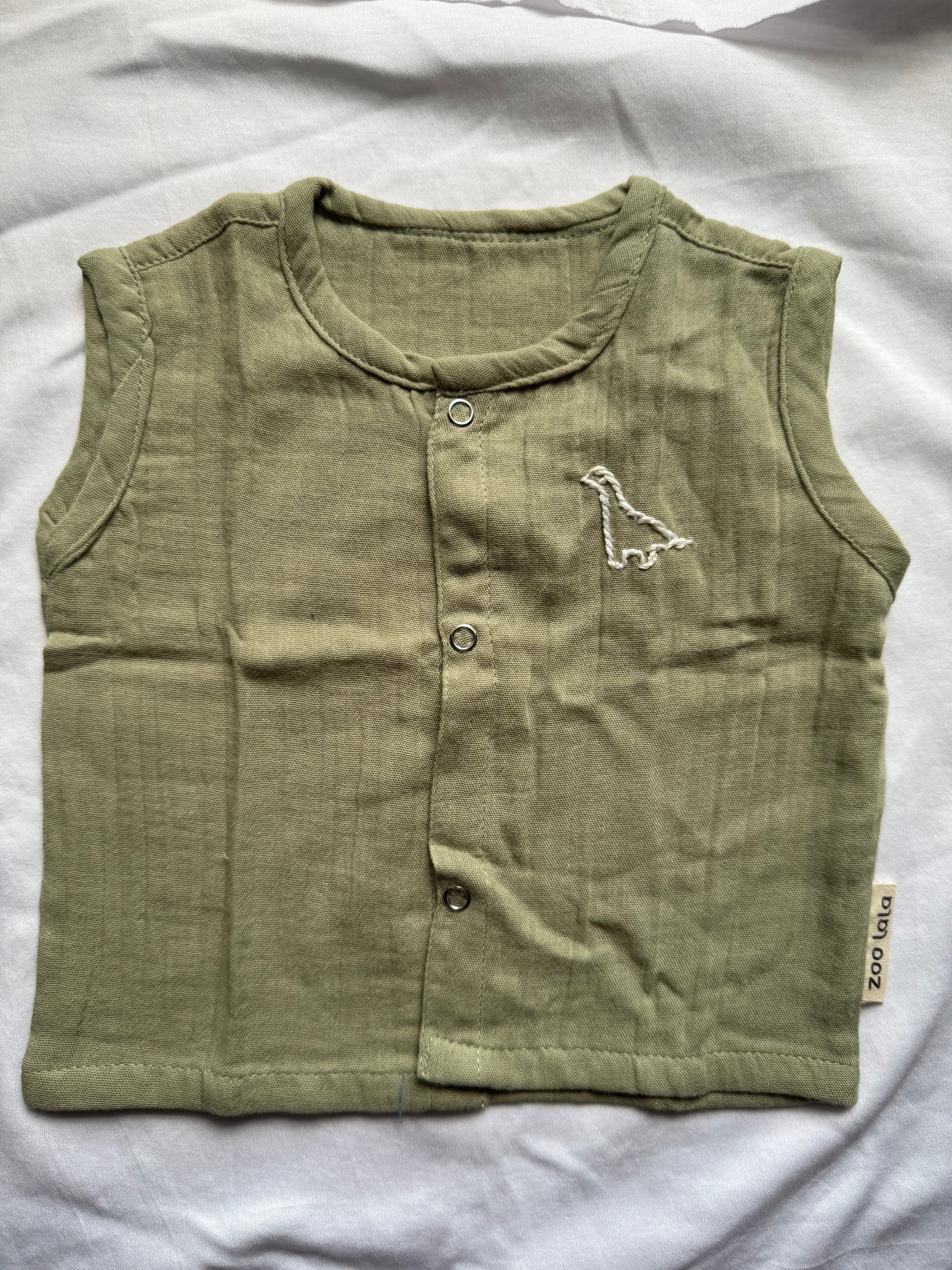 Crafted from soft double gauze muslin, this Dino embroidery jabla offers gentle comfort ideal for sensitive skin. The breathable fabric ensures all-day ease, while the detailed dinosaur embroidery adds a charming, playful touch. Perfect for layering, it combines quality materials with expert craftsmanship to provide both style and functionality.